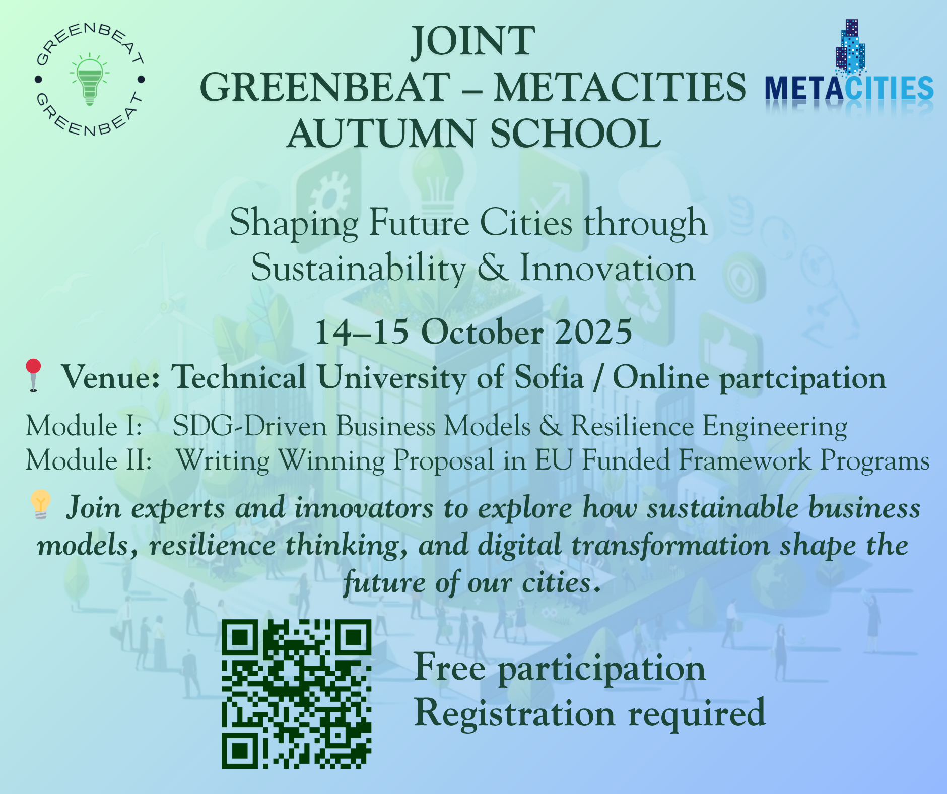 Join the Greenbeat-Metacities Autumn School (Oct 14β15) to learn sustainable business models, resilience engineering & proposal writing.